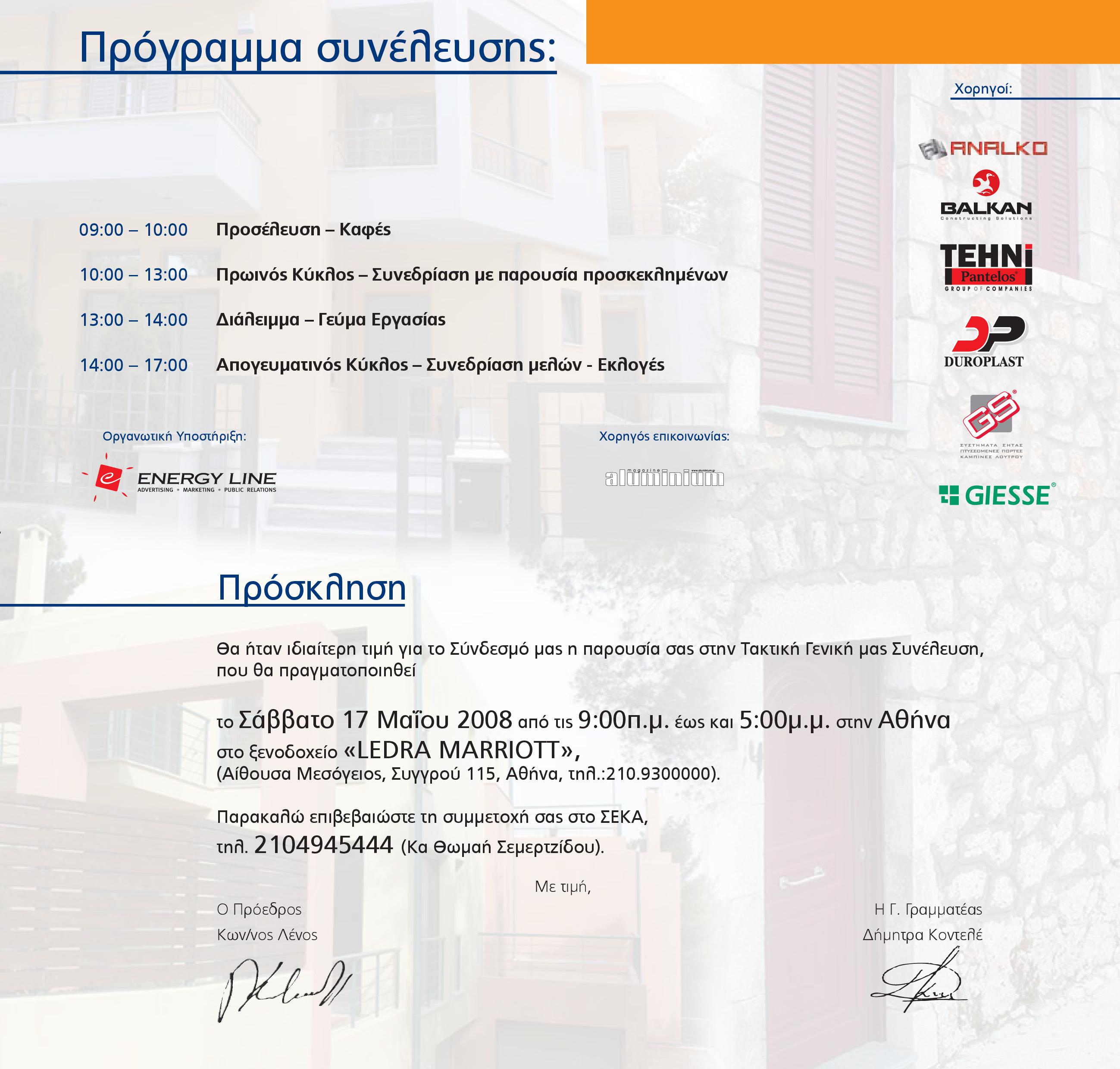 Με ιδιαίτερη επιτυχία έγινε το Σάββατο 17 Μαΐου η προγραμματισμένη Εκλοαπολογιστική Συνέλευση του Συνδέσμου Ελλήνων Κατασκευαστών Αλουμινίου (ΣΕΚΑ) στο ξενοδοχείο Ledra Marriott με την ευγενική χορηγία των εταιρειών ANALKO, BALKAN, TEHNI PANTELOS, DUROPLAST,G–S και GIESSE και την άρτια διοργάνωση της ENERGY LINE.
